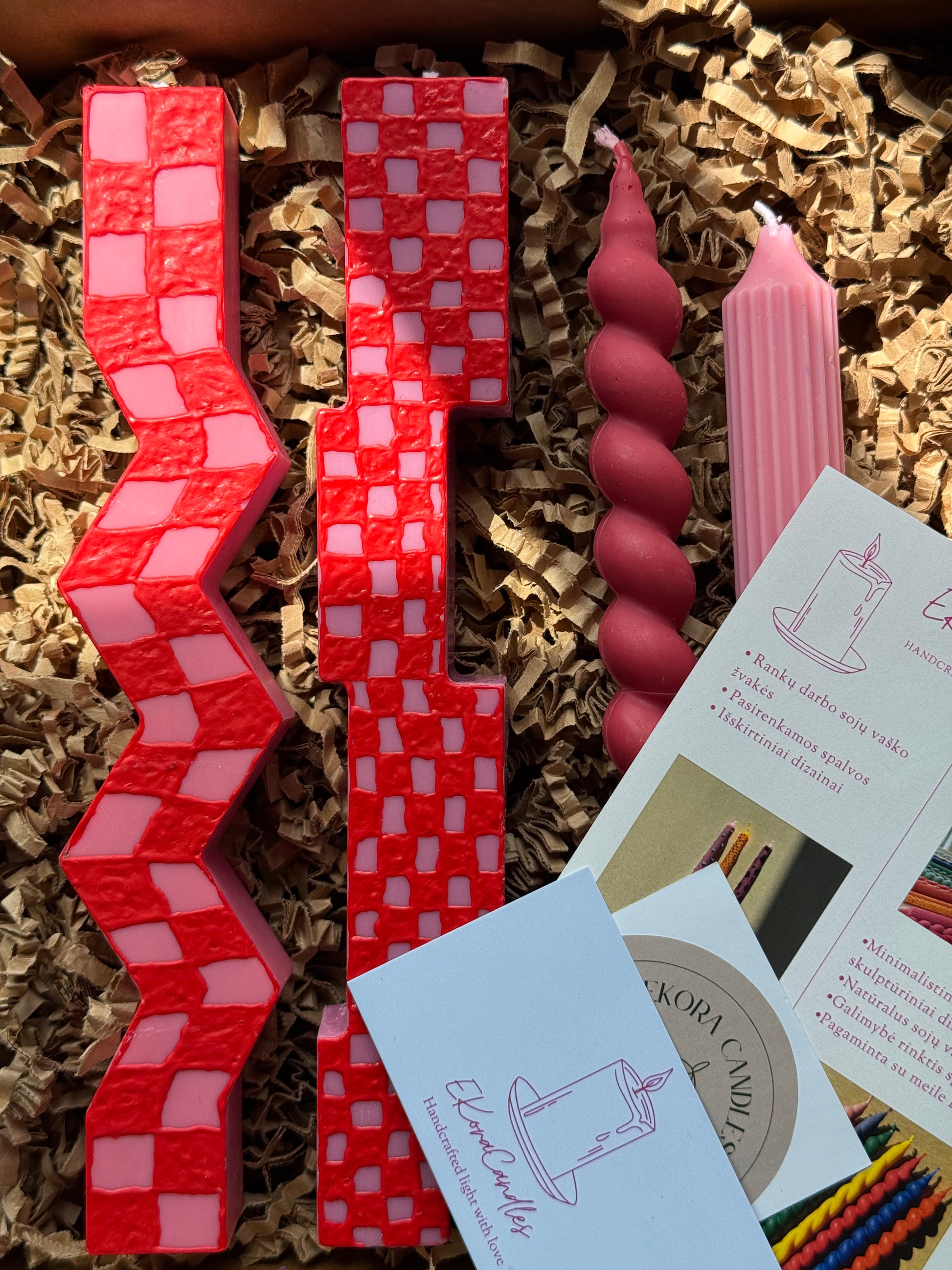 A pink lover’s dream decoded — bold checkered art and soft lines dance in this lively candle set.