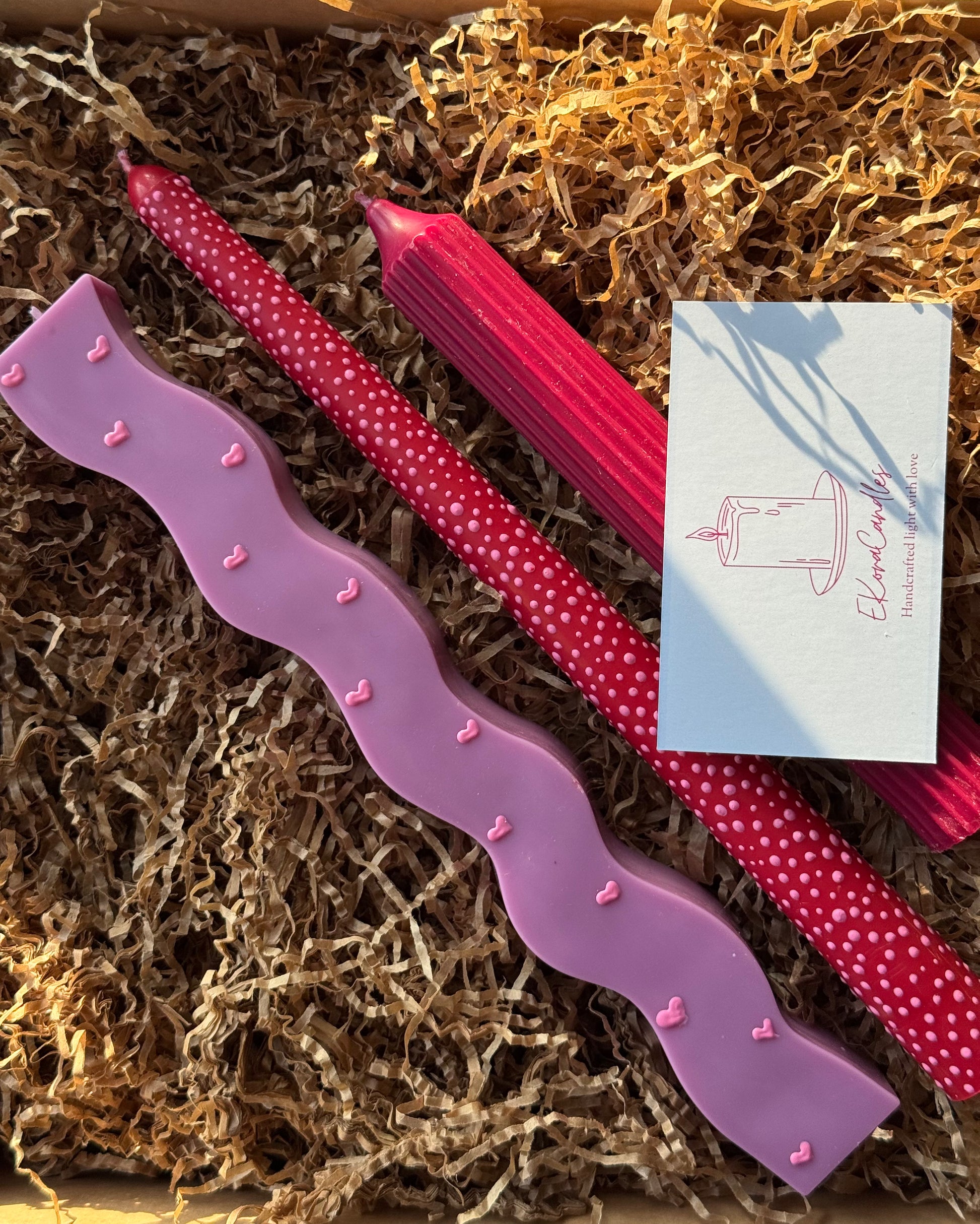 Šis rinkinys sukurtas jaukioms akimirkoms – sau arba žmogui, kuris svarbus. Rankų darbo žvakės dekoruotos subtiliomis širdelėmis, kurios suteikia šilumos ir meilės nuotaiką namams.