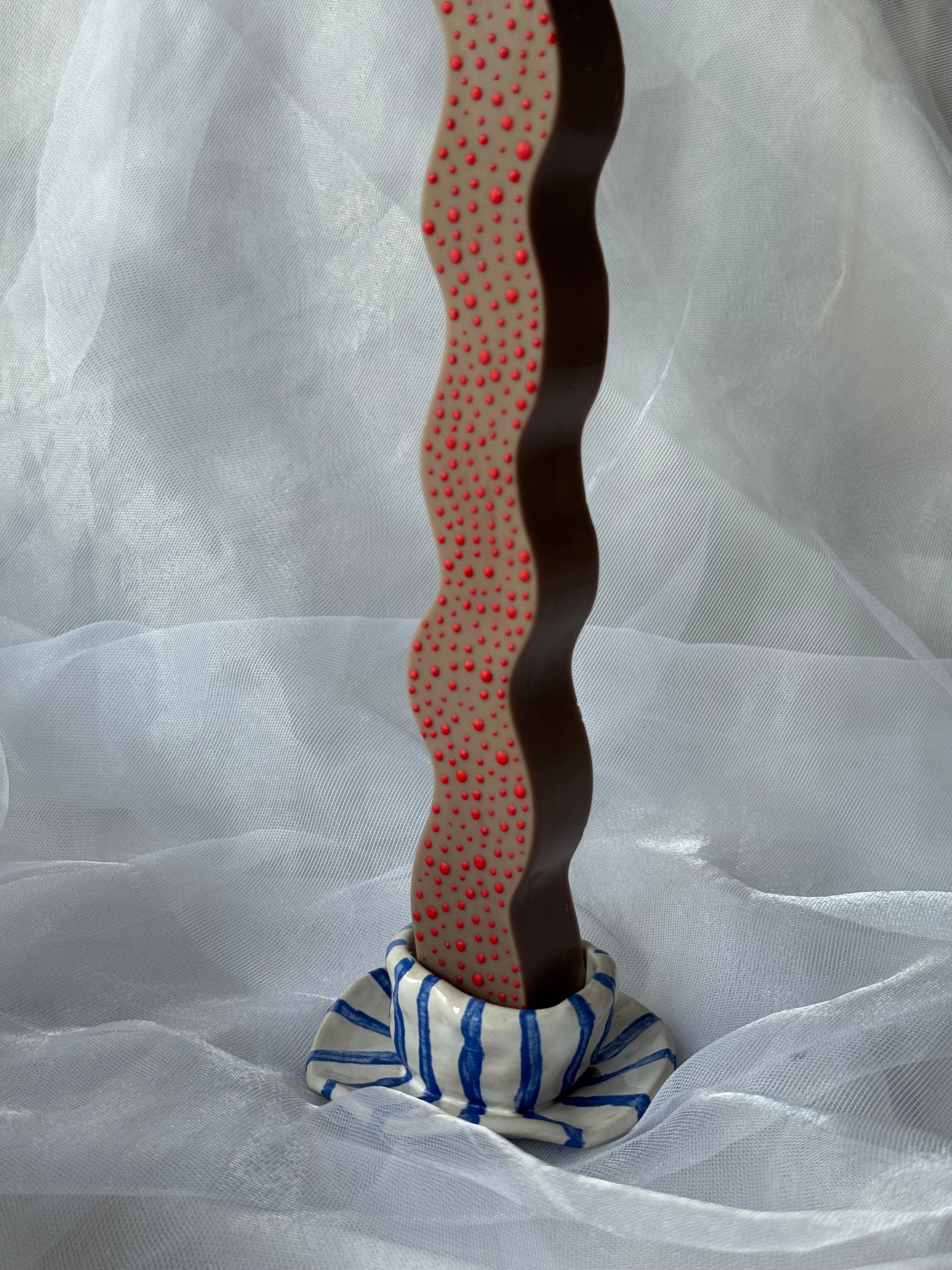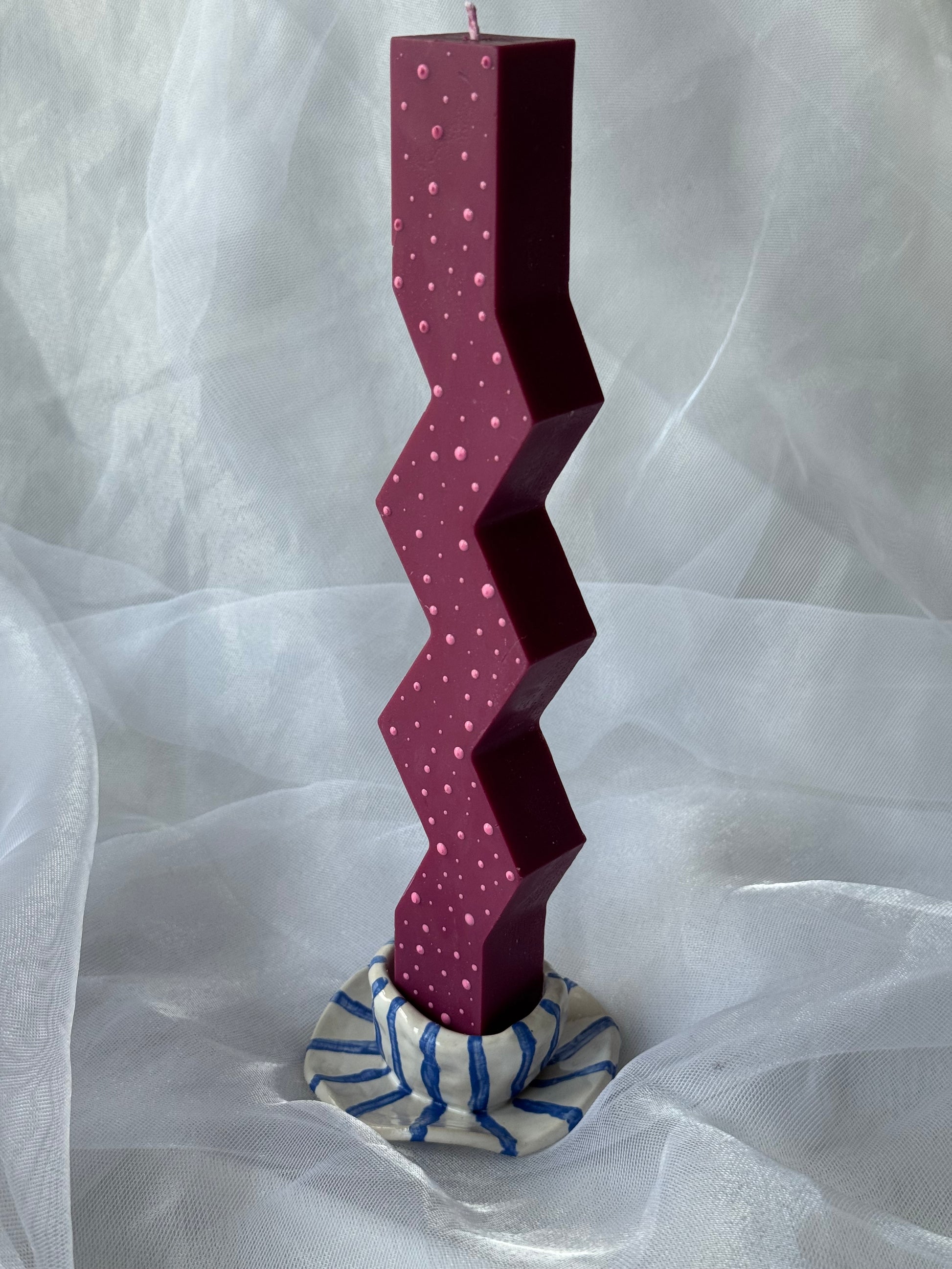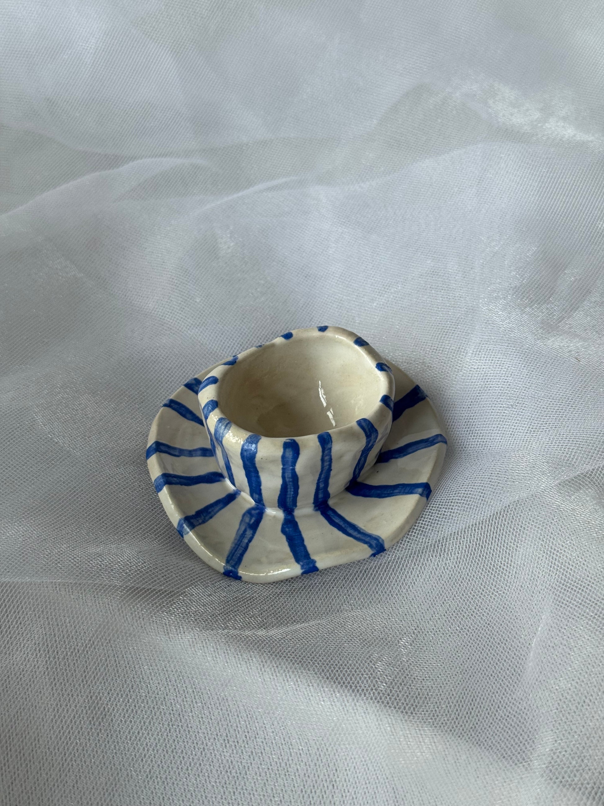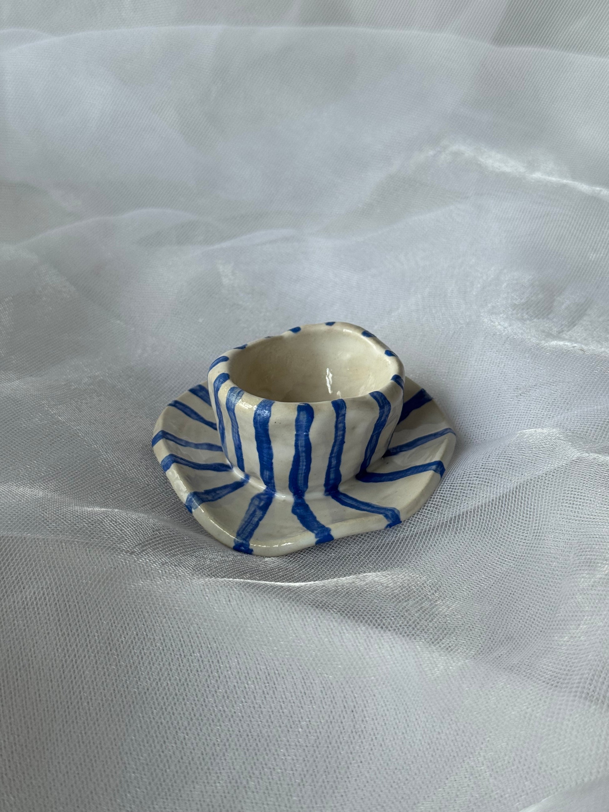 Puodelio formos keraminė žvakidė su mėlynomis linijomis.