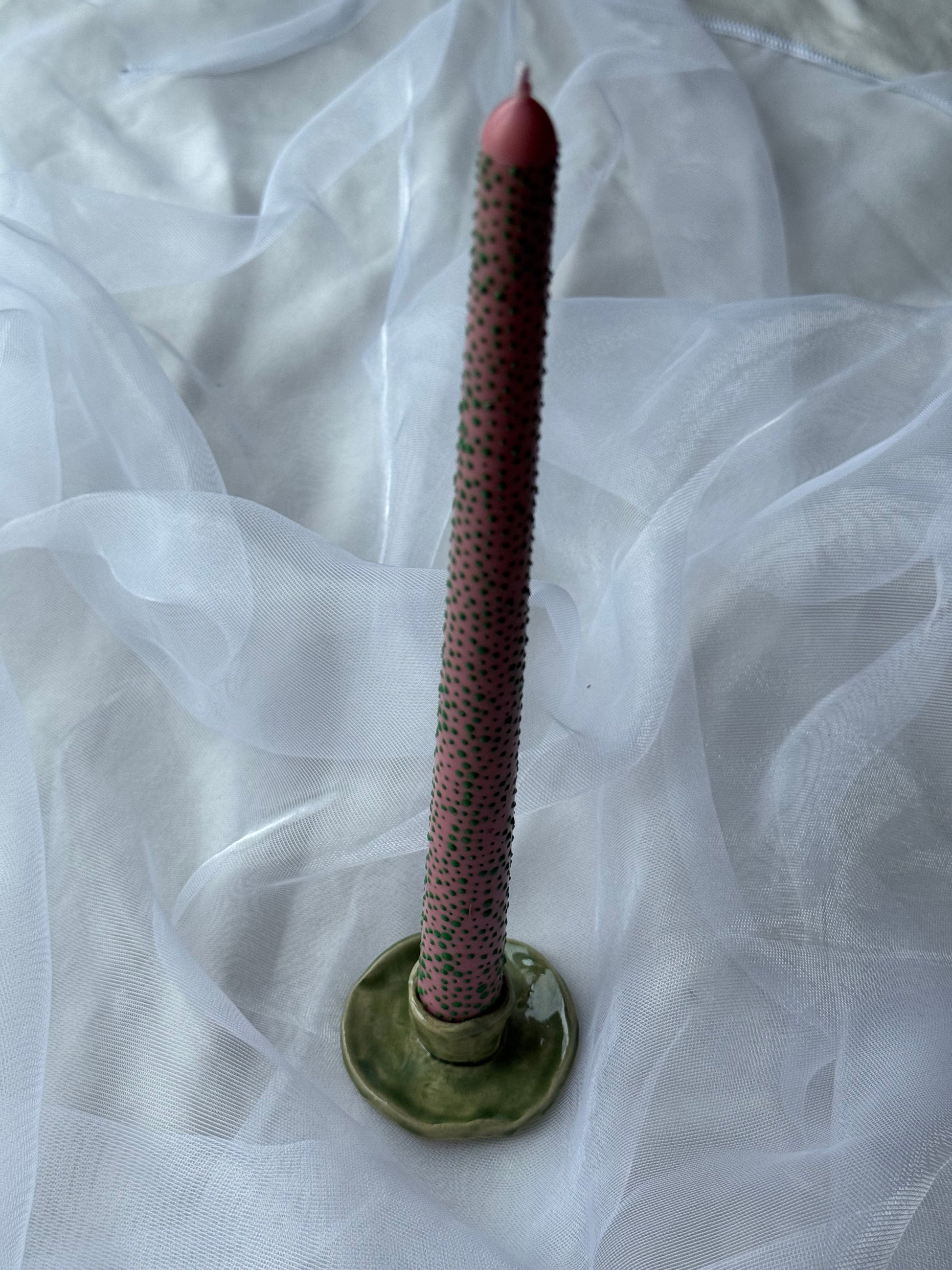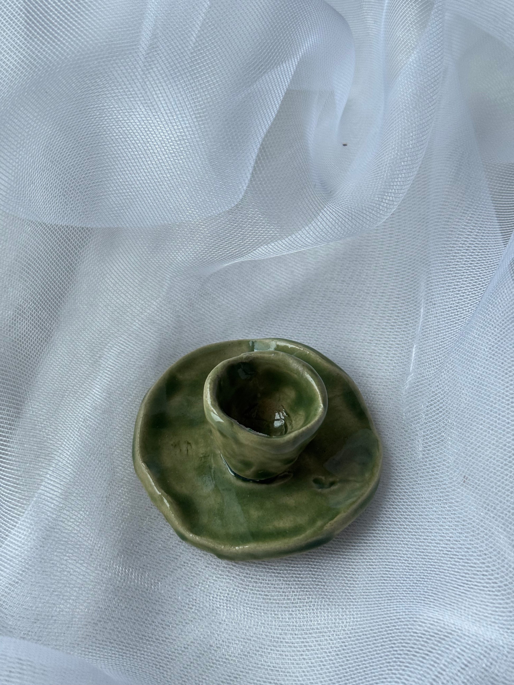 Maža keraminė žvakidė, žemiška žalia spalva. Paprasta, rami ir ideali jaukiam vakariniam apšvietimui.