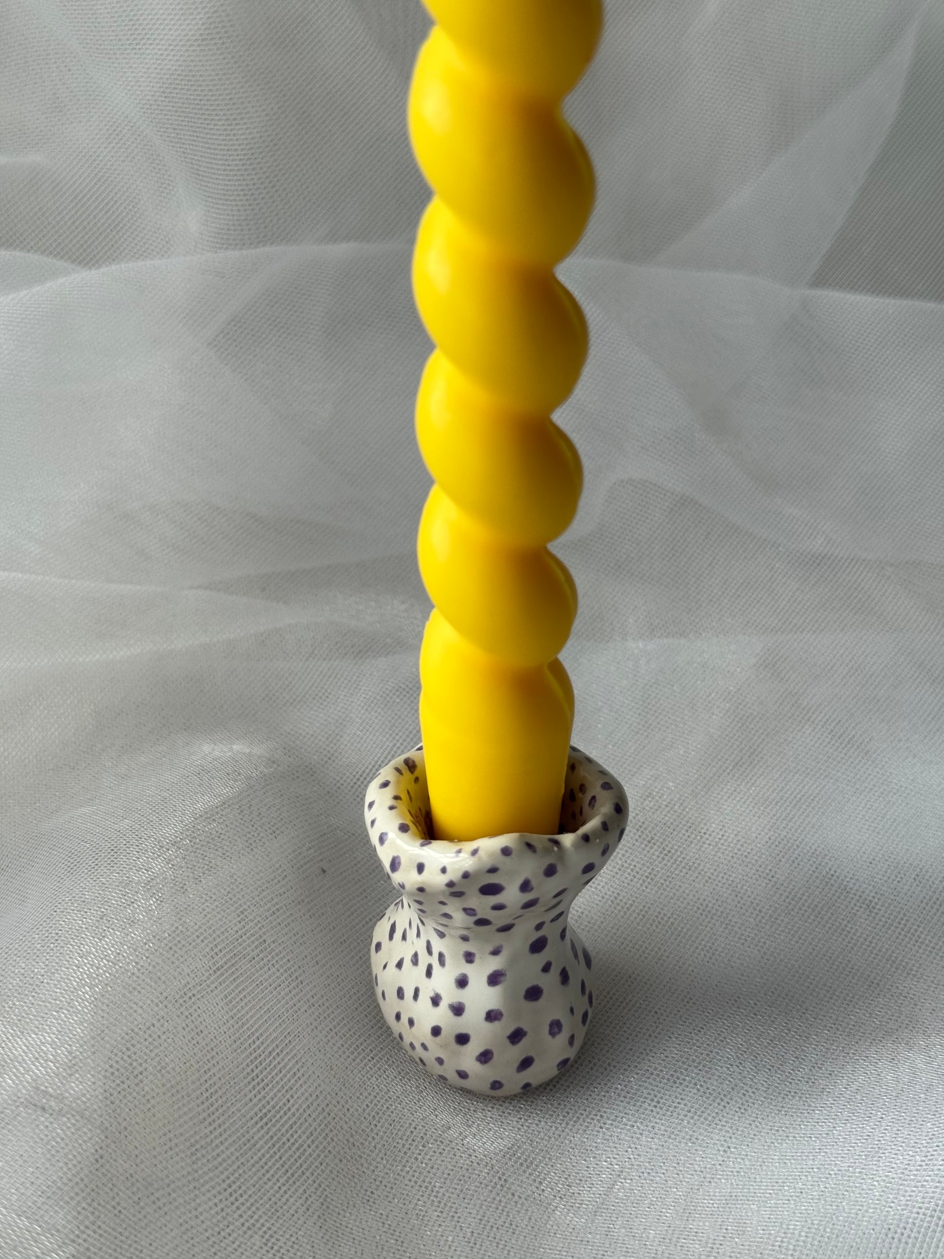 Balta su žaismingais alyviniais taškeliais – paprasta, žavinga ir miela. Priderinkite Soft Spira žvakę drauge.
