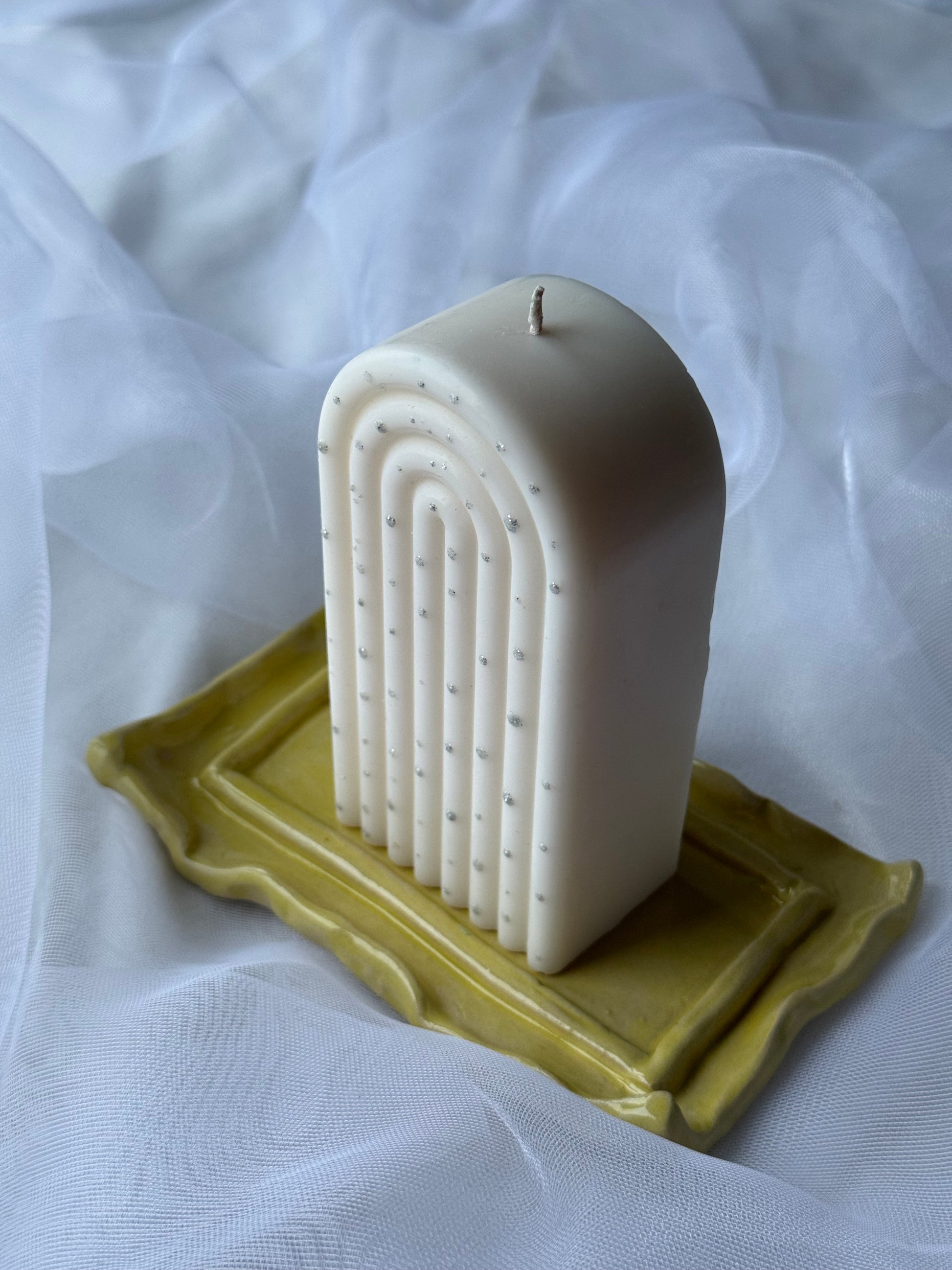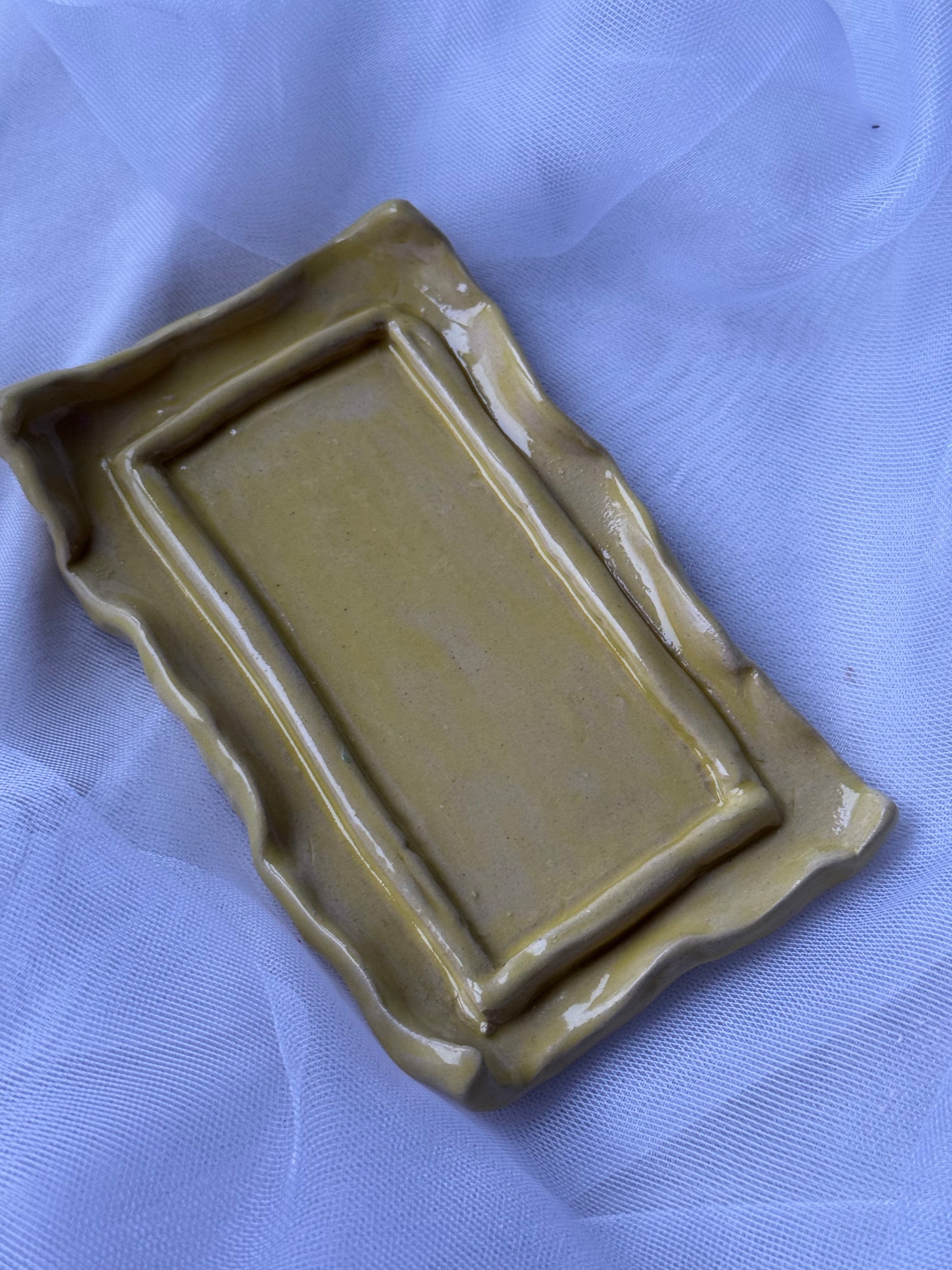 Saulėtas geltonas keraminis padėkliukas su skulptūriniu rėmelio kontūru.