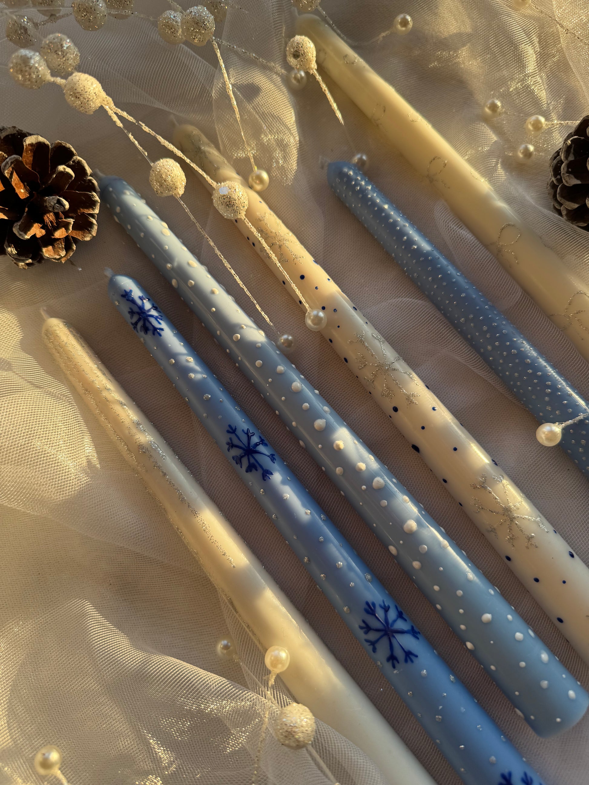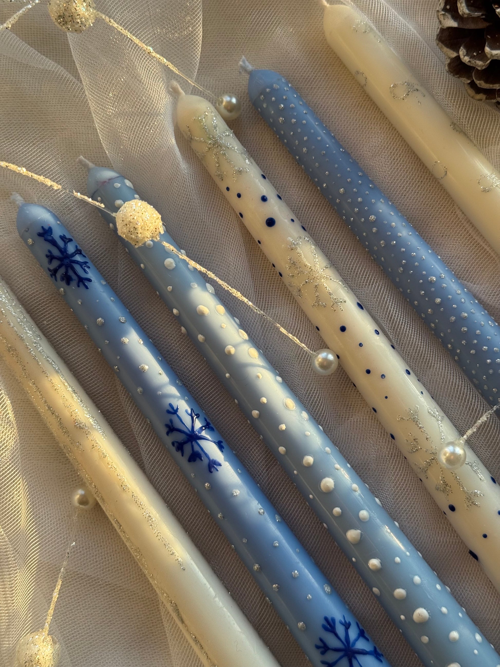 - Snowflake Dream – mėlyna žvakė su snaigėmis ir sidabriniais taškeliais – žiemos pasaka liepsnoje.